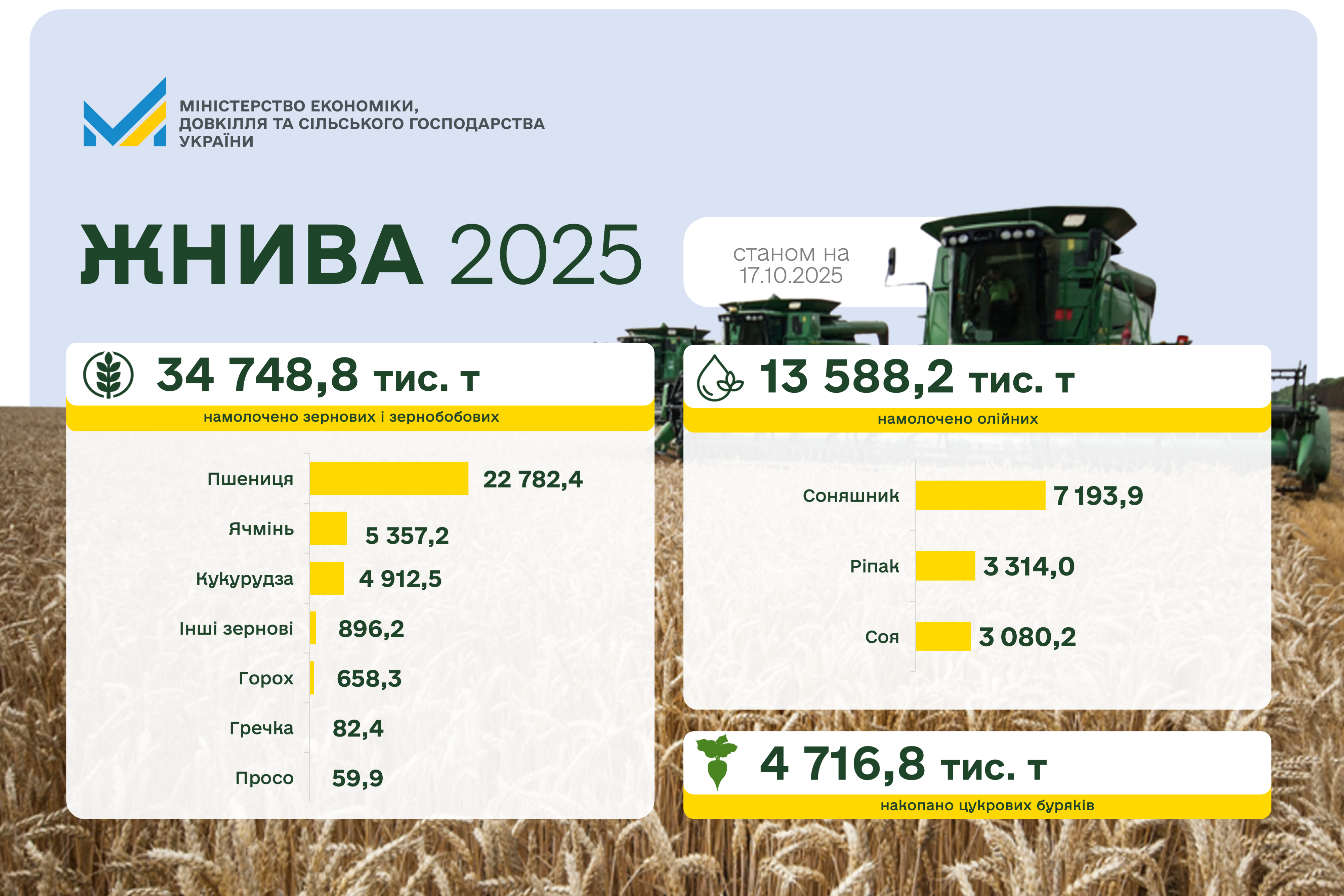 Станом на 17 жовтня 2025 року в Україні вже зібрано 34 748,8 тис. тонн зернових культур на площі 7 979,1 тис. га. Обмолочено 69% площ, засіяних цими культурами.