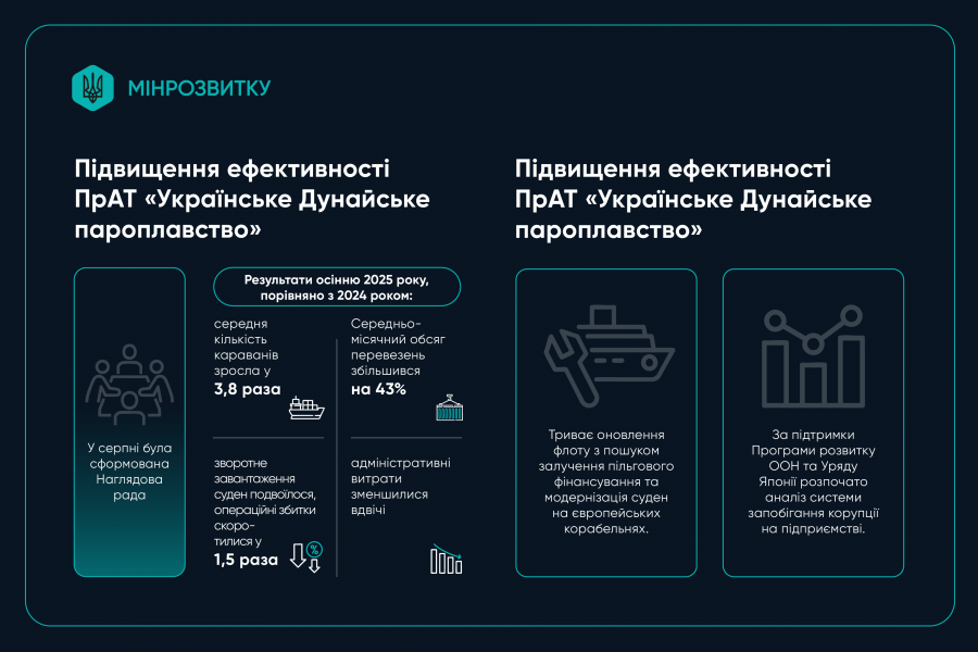 Значно зросла ефективність роботи головного національного перевізника на Дунаї — ПрАТ «Українське Дунайське пароплавство». У серпні була сформована Наглядова рада, що стало ключовим кроком у впровадженні сучасних стандартів корпоративного управління. Вже протягом осені це дозволило суттєво оптимізувати роботу річкового вантажного флоту: середня кількість караванів зросла у 3,8 раза, середньомісячний обсяг перевезень збільшився на 43%, а зворотне завантаження суден подвоїлося. Завдяки впровадженню нових корпоративних практик та оптимізації витрат операційні збитки скоротилися у 1,5 раза, а адміністративні витрати зменшилися вдвічі.