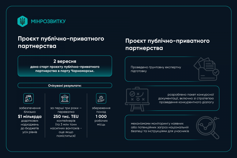 Паралельно ведеться підготовка інших проєктів публічно-приватного партнерства, зокрема Паромного комплексу в Чорноморську, де розроблено техніко-економічне обґрунтування, отримано експертний висновок та завершується підготовка висновку про доцільність.