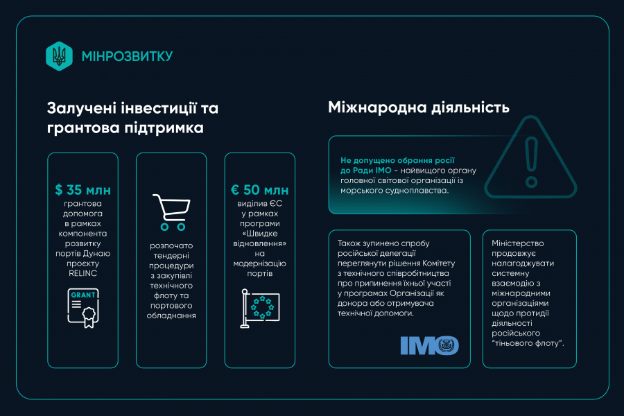 Мінрозвитку також активно працює над залученням міжнародної підтримки. У 2025 році Україні надано грантову допомогу на суму 35 млн доларів США у рамках компонента розвитку портів Дунаю проєкту RELINC, розпочато тендерні процедури з закупівлі технічного флоту та портового обладнання. Крім того, ЄС виділив 50 млн євро у рамках програми «Швидке відновлення» на модернізацію портів.