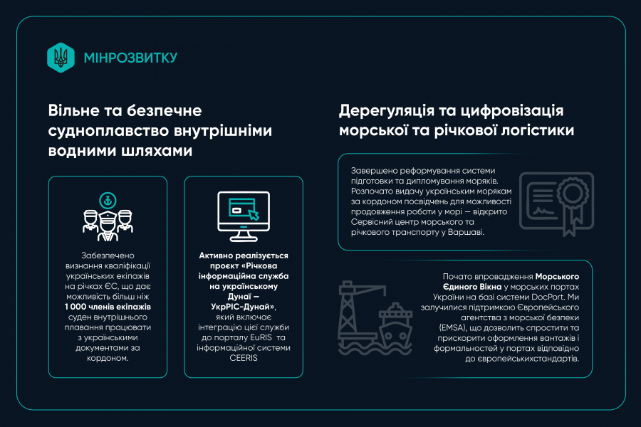 Продовжується цифровізація морської та річкової логістики. Впроваджуються електронні державні реєстри документів моряків та членів екіпажів. Завершено реформування системи підготовки та дипломування моряків. Розпочато видачу українським морякам за кордоном посвідчень для можливості продовження роботи у морі — відкрито Сервісний центр морського та річкового транспорту у м. Варшава (Польща).