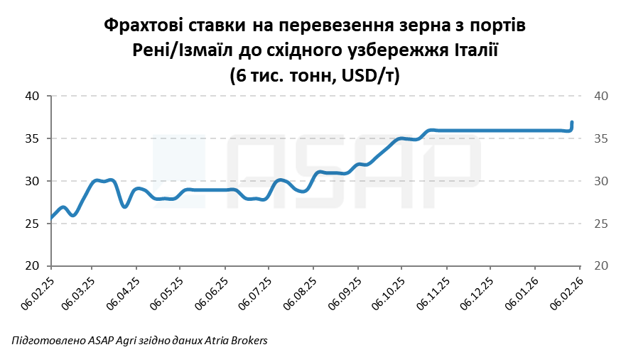 Фрахтовий відділ Atria Brokers оцінює фрахт для відвантаження 30 000 т кукурудзи з українських глибоководних портів до східного узбережжя Італії на рівні 25–26 USD/т, зниження на 1 USD/т за тиждень.