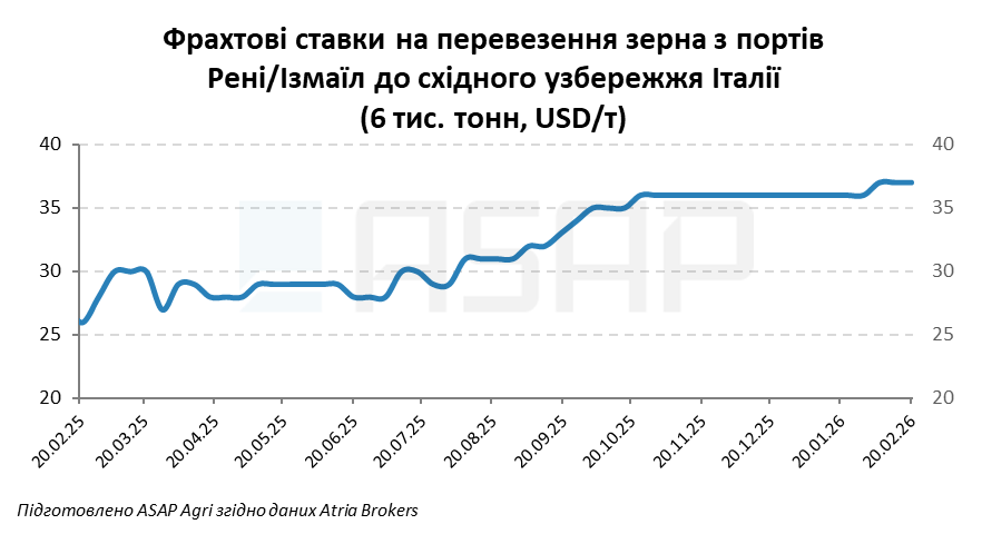 Фрахтовий відділ Atria Brokers оцінює фрахт для відвантаження 30 000 т кукурудзи з українських глибоководних портів до східного узбережжя Італії на рівні 25 USD/т, без змін за тиждень.