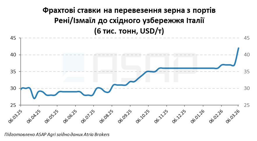 Фрахтовий відділ Atria Brokers оцінює фрахт для відвантаження 30 000 т кукурудзи з українських глибоководних портів до східного узбережжя Італії на рівні 26 USD/т (+1 USD/т за тиждень).