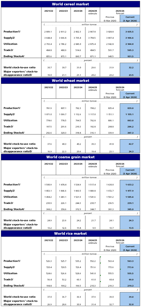 Прогноз щодо обсягу запасів зернових у світі на кінець сезону 2026 року був знову підвищений і на даний час становить рекордні 951,5 млн тонн, що на 9,2 відсотки вище за рівень минулого року. Це коригування обумовлене переглядом у бік підвищення обсягу запасів пшениці в Європейському союзі у зв’язку з уповільненням темпів експортних поставок, а також в Ісламській Республіці Іран внаслідок активніших, ніж очікувалося, імпортних закупівель. Прогнози щодо запасів пшениці також переглянуті у бік підвищення в Узбекистані внаслідок покращення видів на врожай та в Індії, де прогнози щодо запасів кукурудзи на кінець сезону були підвищені після того, як підтвердилися очікування більшого, ніж передбачалося раніше, обсягу виробництва. За прогнозами, показник співвідношення обсягу запасів та споживання зернових у світі станом на кінець сезону 2025–2026 років становитиме 32,2 відсотки, що також свідчить про те, що ситуація із пропозицією збережеться на прийнятному рівні. Станом на кінець сезону 2025–2026 років запаси рису у світі можуть зрости на 4,2 відсотки до рекордного рівня в 219,3 млн тонн, що обумовлено очікуваним накопиченням запасів у країнах-експортерах (насамперед в Індії, а також у Бразилії, В’єтнамі та Таїні у Китаї, а також у Бангладеш та Індонезії).