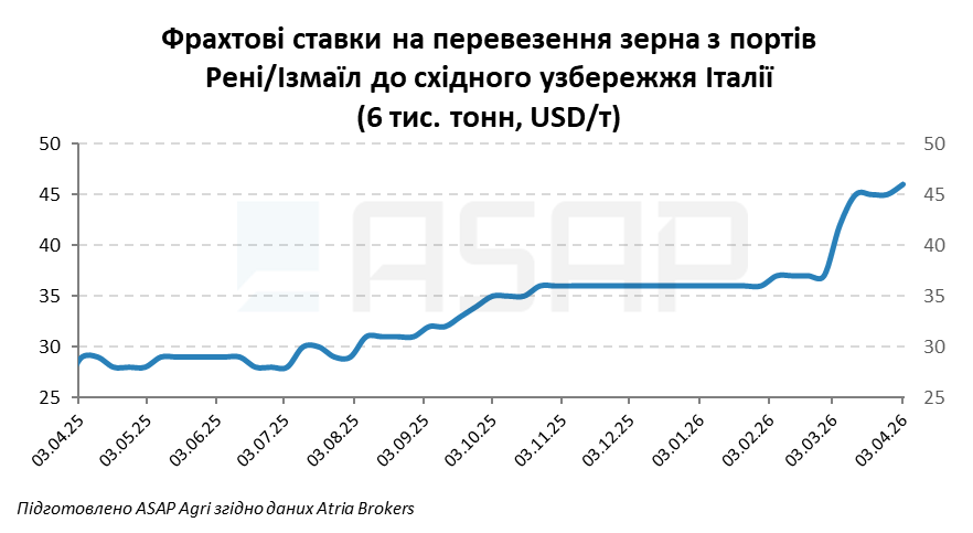 Фрахтовий відділ Atria Brokers оцінює фрахт для відвантаження 30 000 т кукурудзи з українських глибоководних портів до східного узбережжя Італії на рівні 30-31 USD/т, що на 1 USD/т вище показника минулого тижня.